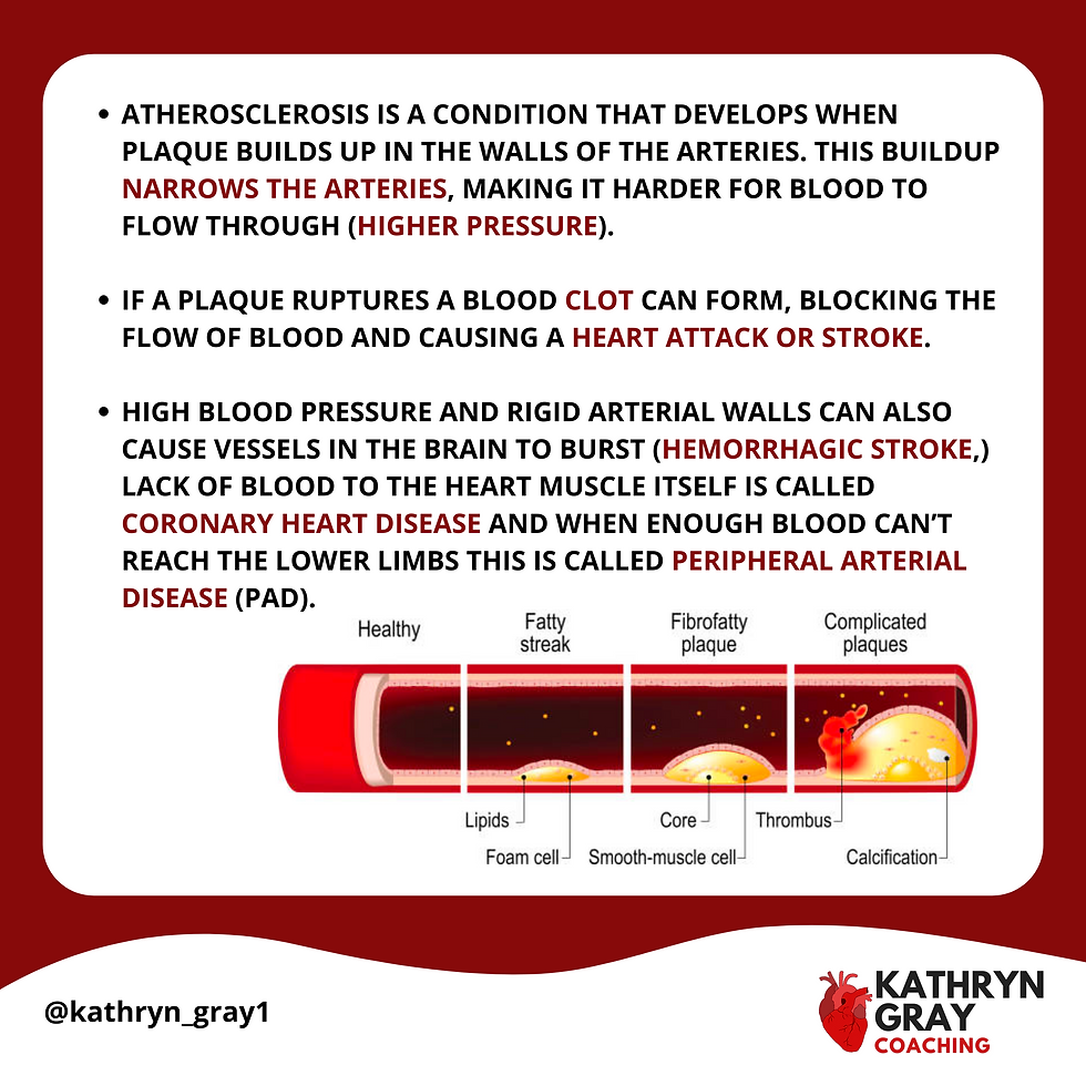 High blood pressure and rigid arterial walls can also cause vessels in the brain to burst (hemorrhagic stroke,) lack of blood to the heart muscle itself is called Coronary heart disease and when enough blood can’t reach the lower limbs this is called peripheral arterial disease (PAD).